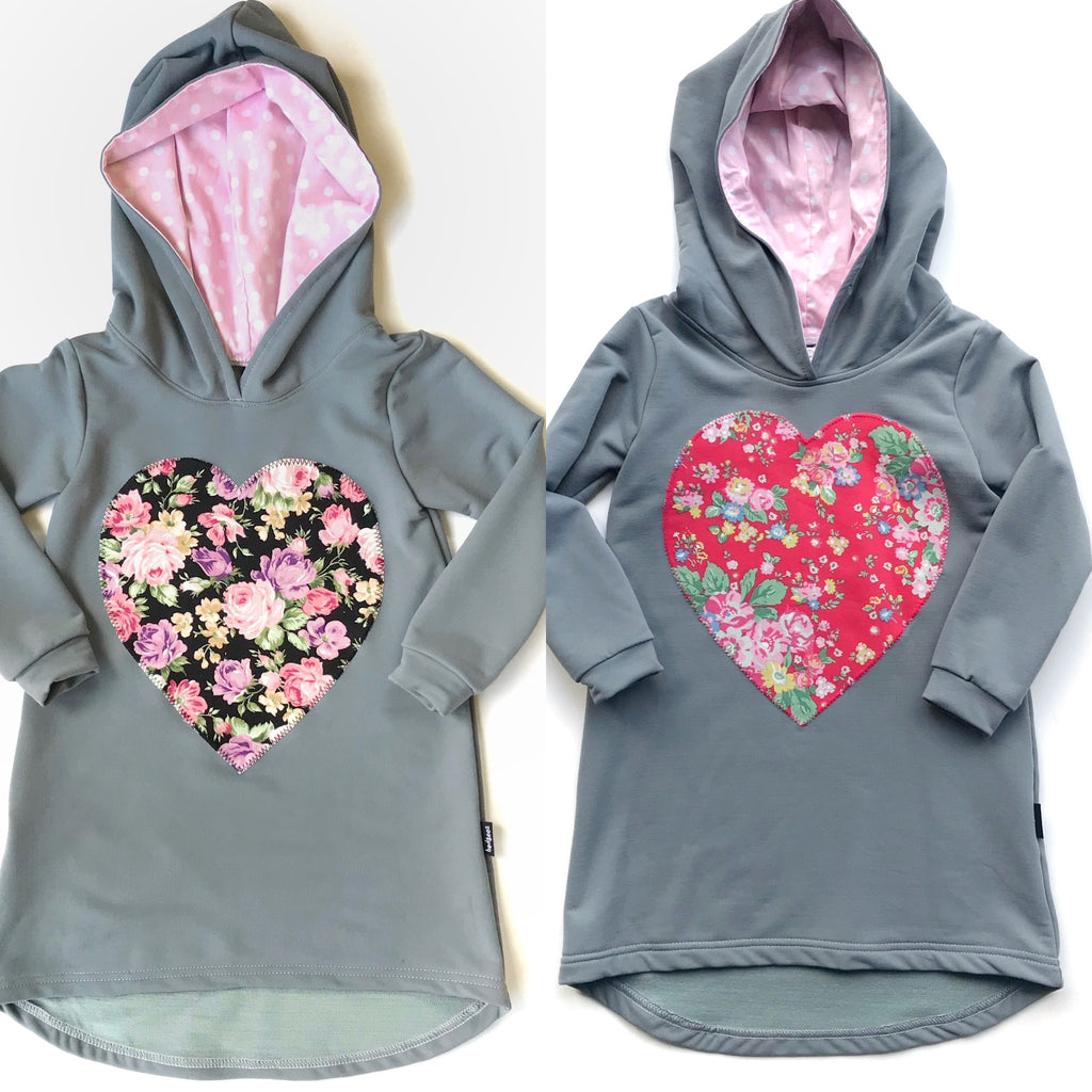 Hard wearing and warm merino blend hoodie dress with a fabulous fabric heart on the front.Merino/polyester/elastane blend.